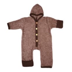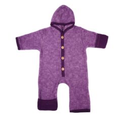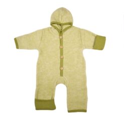 Warme overall van wolfleece. Gemaakt van 60% wol en 40% katoen. Deze mix zorgt voor lekkere warmte en is ook nog een wasbaar in de wasmachine. De mouwen en pijpjes kunnen in het begin omgeslagen worden voor extra warme handjes en voetjes. Later zal dat niet meer passen, terwijl het pakje zelf nog wel past.